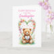 Send birthday wishes to your granddaughter on her first birthday in the cutest way possible with this lovely card. A teddy bear, in front of a bunch of colourful flowers, presents a heart showcasing the age of 1. Make their birthday unforgettable with this charming card. A 1st birthday card for a granddaughter.