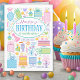 A pretty pastel feminine birthday card for your granddaughter full of every thing birthday and party related for her. Cakes, presents, balloon, flowers, and party hats fill the card and also form the bottom border on the inside of the card.