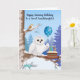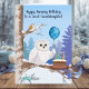This charming January birthday card showcases a beautiful Snowy Owl holding a snowflake balloon while sitting beside a rich chocolate birthday cake. In the background, a small Barn Owl watches from a snowy winter scene, adding a touch of nature and seasonal magic. Perfect for anyone with a January birthday who loves owls, wildlife, and cozy winter themes, this unique nature-inspired birthday card brings charm, warmth, and winter wonder to their special day.