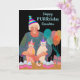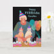 Happy PURRthday, paper greeting card featuring a colourful birthday cat party illustration with an older lady and two cats in party mode. The cats are wearing party hats as well as the lady. A row of cupcakes with birthday candles are on the table. Balloons and a gift are also in the design. Art, image, and verse copyright © Shoaff Ballanger Studios, 2023.