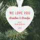 Cute Christmas ornament gift for Grandma and Grandpa. On the front, your picture fills a heart-shaped frame. On the reverse, you can personalise the expression to "I Love You" or "We Love You," and personalise whether they are called "Grandma & Grandpa," "Nana & Papa," "Mommom & Poppop," etc. You can also add the grandchild's or grandchildren's names and year, all in red typography against a white background.