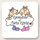 Two adorable babies in a lavender and pink sleeper and text that reads "Grandma of Twin Girls" on new grandma of twin girls keepsake boxes, tiles, ornaments, mugs, magnets, cards, stickers, tote bags, and other grandma clothing and gifts.