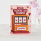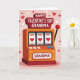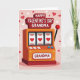 This greeting card shows a retro slot machine front and center on a soft pink background sprinkled with small red and white hearts. The machine is mostly orange with deep red accents, and it has shiny buttons along the bottom plus a black lever on the side topped with a red ball. Across the top, a raised banner reads “HAPPY VALENTINE’S DAY GRANDMA” in white letters, placed right above the reels so it’s the first thing you notice. In the middle, the three reels line up to show three glowing red hearts, like a lucky win for love. A smaller panel below also says “GRANDMA” in white lettering, reminding you exactly who this is meant for. The whole scene feels sweet and a little funny in a warm way, like saying your love for her is a sure thing. It’s a meaningful card to give because it mixes familiar Valentine hearts with a fun “jackpot” idea that says she’s treasured 🥰❤️. Hope it helps you share Valentine’s Day sentiments with someone you love.