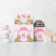 This Christmas gift wrap has a crest with leopards wearing wreaths with a hot pink monogram initial. You can personalize with  your initial.
