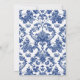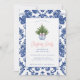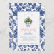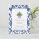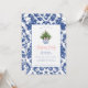 This Christmas party invitation has a preppy grandmillennial design featuring a Christmas Tree in a blue and white Chinoiserie pot crest with a blue and white border around the edge. The front and back have a coordinating damask pattern.