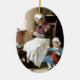 A beautiful painting with a grandmother and granddaughter sewing and a cat playing with a yarn ball.