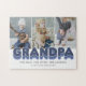 Cute grandfather jigsaw puzzle featuring 3 family pictures for you to replace with your own, the title "grandpa", a personalised saying that reads "the man, the myth, the legend", and the grandkids names.