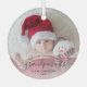 Help them celebrate their first grandchild with this beautiful modern keepsake ornament. The off-black text reads "Our first Christmas as grandparents," with the word "grandparents" in elegant handwriting script with flourishes before and after. Easily replace the sample image with your favorite photo of the new baby, and add his or her name and the year. A white gradient filter helps make the text pop.