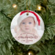 Help them celebrate their first grandchild with this beautiful modern keepsake ornament. The burgundy red text reads "Our first Christmas as grandparents," with the word "grandparents" in elegant handwriting script with flourishes before and after. Easily replace the sample image with your favourite photo of the new baby, and add his or her name and the year. A white gradient filter helps make the text pop.
