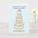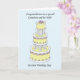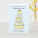 Large, tiered, lemon coloured wedding cake on a pale blue background with the words 'To a wonderful Grandson and his wife on their wedding day'.