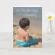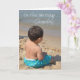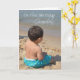 A birthday card for a Grandson with a photo of a little dark haired boy with bright blue shorts on sitting in the sand at the beach with water a little away.