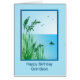 A lovely sea fishing scene. A wonderful birthday card for a grandson who loves fishing, or just loves the sea. Tall grasses frame a view of a calm ocean with a small boat and a man fishing. The inside verse has the fisherman's good luck wish 'tight lines'.