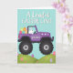 This card shows a purple off-road vehicle with chunky black tires rolling across soft spring-green hills under a clear sky-blue background 🌷. In the driver’s seat, a white long-eared bunny sits upright, and its gentle forward gaze gives the scene a friendly, caring tone 🐰. The open back is piled with colorful patterned eggs in pink, orange, yellow, teal, and purple, like a cheerful delivery meant for someone special. A few smaller decorated eggs dot the grassy slopes, with tiny hearts tucked between them to suggest affection without needing a big gesture. Near the top, the phrase “A Load of EASTER LOVE” is set in white lettering, standing out clearly against the blue sky. The word “grandson” appears in small lettering on the side of the vehicle, placed like a name tag on the door. The rolling landscape is drawn with smooth curves and light shading, keeping the focus on the bunny driver and the egg-filled cargo. The eggs in the back show stripes, dots, and simple patterns, and a couple of tiny hearts sit near the scattered eggs on the hills.