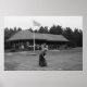 Old 1910s photo of woman in long dress lining up a putt on the golf course, Hotel Champlain, Bluff Point, New York. Club house in the background.