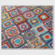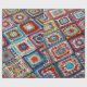 Multicolored crochet granny squares are arranged in a grid each featuring a unique pattern of concentric shapes