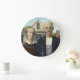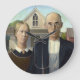 This is Grant Wood’s famous painting “American Gothic,” painted in 1930. A farmer holding a pitchfork is standing beside his spinster daughter. Grant Wood’s sister, Nan, modelled for the daughter, and their dentist is the model for the farmer!