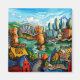 This classic Vancouver scene is what you see when you cross the Granville Street bridge. It includes the mountain backdrop, a bit of Stanley Park, the Granville Island ferry terminal, and the lovely art deco Burrard Street bridge surrounded by boats and buildings. I wanted to emphasize the contrast of the uniformly designed and reflective downtown office buildings against the neon-bright ex-industrial Granville Island community. The downtown buildings always seem tall and willowy but all very similar, like a field of flowers turning towards the sun while Granville Island is all crazy-irregular and bright.