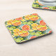 A watercolor ai illustration pattern of lemons, limes, oranges and grapefruits. Juicy citrus in coral, yellow and lime green outdoors coaster.