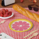 Paper plates designed to look like the inside of a grapefruit.