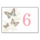 Beautiful graphic art three butterflies painted lady with a swallowtail and floral swirl wedding table number card in pink, cream, aqua teal and brown. A great idea to help guests find their seats at your wedding. Original design and butterfly ink sketches by Sarah Trett.