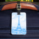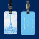 Eiffel Tower in blue and white . Graphic design by Alma Wad based on a vintage image .You have to customise the other side to get your own personal bag tag .