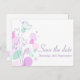 A beautiful and simple pink purple and mint green flower outline and graphic petals save the date wedding postcard. Part of the graphic modern flower petal wedding set. An elegant exclusive design by Sarah Trett.