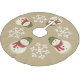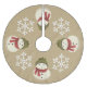 Happy snowman wearing a green hat and a red scarf decorate the tree skirt with snowflakes on a brown skirt.