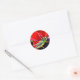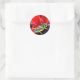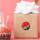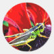This brilliantly coloured sticker features a shiny green, yellow and black grasshopper perched on the purple centre of a flower with gorgeous red petals.