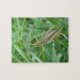This awesome puzzle features a detailed macro photograph of a small green grasshopper with brown mottled markings sitting on the grass. In the photograph you can see the detail of the jointed legs, long antennas and black and gold eyes of the grasshopper.