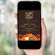 A bistre, dark brown background. Decorated with pumpkins and orange and yellow flowers. Personalise and add the party details.