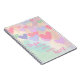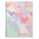 Hearts of red, pink, purple, yellow and green floating on an abstract watercolor background of greens, yellow, pinks and orange. This notebook would be great for a diary, gratitude journal or for school. The design is a reminder that when love flows, our heart glows. You deserve a life of love!
