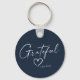 Attract that positive energy with a "Gratitude" round aluminium keychain - keyring (double sided), featuring a unique custom design with "Grateful" in elegant handwritten script, a beautiful hand drawn heart and your personalised name. North sea blue and white or easily edit the primary colour as you like. A great gift for yourself and maybe someone else.