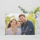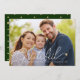 Simple, modern photo holiday card reading Grateful in stylish swirly script calligraphy, with your name, wishes and year below. On the back are printed golden dots and stars on christmas dark green.