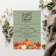 A muted moss green coloured background. Decorated with pumpkins and orange and yellow flowers. Personalise and add the party details.