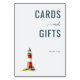 This wedding tabletop sign features a minimalist design with a lighthouse illustration on the lower left, set against a clean white background. The color palette includes deep navy blue text and vibrant red and white stripes on the lighthouse, creating a cheerful and inviting aesthetic. Bold sans-serif typography highlights "CARDS and GIFTS" at the top, while "Thank You" is subtly placed below, conveying gratitude in a modern style. The semi-realistic representation of the lighthouse adds maritime charm, making this sign perfect for expressing appreciation at your special event.