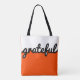 Modern and simple Orange Black White colour block tote bag featuring grateful script lettering. Perfect to create an atmosphere of positivity and gratitude while you are out and about. Ideal for anybody who practices law of attraction, abundance, manifesting and who wants to focus on all the blessings and positive aspects of life.