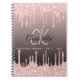 Rose gold, pink faux glitter drip, paint dripping look. Black, brown, coffee latte coloured ombre background. Personalise and add your name, and monogram initials and a title, gratitude journal. The name is written with a modern hand lettered style script. Black and rose gold coloured letters.
