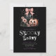 At the top of the invitation, a quirky and fun gravestone marked with "RIP" adds a touch of spooky charm. The black and white gravestone is playfully adorned with a polka-dotted bow, adding a whimsical element to the design. Surrounding the gravestone are vibrant pink and black flowers, along with a striped jack-o'-lantern, bringing a mix of festive, spooky, and modern touches that make the invitation both fun and stylish.