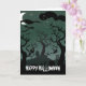 Graveyard black and gray Halloween card design, featuring a cemetery with spooky trees, graves, crosses, skulls, a witch, an owl, bats, and clouds and the crescent moon over it on gray-green background.