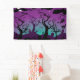 Graveyard black, purple, turquoise Halloween banner, featuring a cemetery with spooky trees, graves, crosses, skulls, a witch, an owl, bats, a ghost, a black cat, clouds and the crescent moon over it on purple and turquoise background.