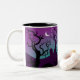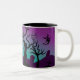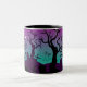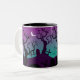 Graveyard purple, turquoise Halloween mug design, featuring a cemetery with spooky trees, graves, crosses, a witch, ghosts and clouds and the crescent moon over it on purple and turquoise background.