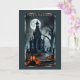This hauntingly beautiful Halloween card captures the eerie atmosphere of a moonlit graveyard, dominated by a towering Gothic mausoleum. The full moon casts an ethereal glow over the scene, illuminating the dark, leaf-strewn path leading to the crypt. A lantern, with its warm, flickering light, adds a touch of contrast to the cold blues and greys of the surrounding night, creating a chilling yet captivating visual.