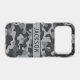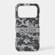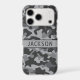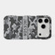 Customize this gray camouflage iPhone 17 pro case with your name in a trendy modern CAP font in dark gray on light gray. It's masculine and perfect for your favorite military, hunting, country or outdoorsman!