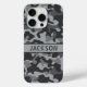 Customize this gray camouflage iPhone 15 pro case with your name in a trendy modern CAP font in dark gray on light gray. It's masculine and perfect for your favorite military, hunting, country or outdoorsman!