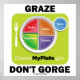 Showcase your wry food groups sense of humour with this poster featuring the logo from USDA's MyPlate.gov along with the saying that will make others do a double-take at their next meal: "Graze Don't Gorge". Note: Poster not endorsed or sponsored by USDA. This poster is designed to provoke thought about the dietary habits of all who eat.
