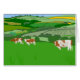 Illustration of three brown and white cows grazing in a green field with a view of meadows and countryside in the distance. Image available on various gifts and products.