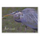 The great blue heron, in the original photograph by ZoeSPEAK on this Note Card, is showing his plumage, looking a bit like a porcupine, fluffing up his feathers to make himself look bigger, to tell another bird that it's his territory. In the photo we see the bird in profile, his grey blue colouring ending in a white head with deep blue bands on each side. His long yellow beak is pointing straight ahead as he walks forward with his long, curved neck tucked back against his body. The background of grasses is in muted earth tones with bits of green throughout. On the cover there is white text which reads "Just a note...". This can be changed or deleted to suit your needs.