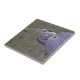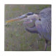 The Great Blue Heron in the original photograph on this small Ceramic Tile is showing his plumage, looking a bit like a porcupine, fluffing up his feathers to make himself look bigger, to tell another bird that it's his territory. In the photo we see the bird in profile, his grey blue colouring ending in a white head with deep blue bands on each side. His long yellow beak is pointing straight ahead as he walks forward with his long, curved neck tucked back against his body. The background of grasses is in muted earth tones with bits of green throughout.