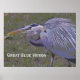 The Great Blue Heron, in the original photograph by ZoeSPEAK on this poster, is showing his plumage, looking a bit like a porcupine, fluffing up his feathers to make himself look bigger, to tell another bird that it's his territory. In the photo we see the bird in profile, his gray blue coloring ending in a white head with deep blue bands on each side. His long yellow beak is pointing straight ahead as he walks forward with his long, curved neck tucked back against his body. The background of grasses is in muted earth tones with bits of green throughout. In the lower left of the picture there is white text which reads "Great Blue Heron". This can be changed or deleted to suit your needs.