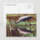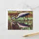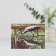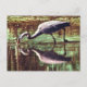 This postcard features the Great Blue Heron, a large wading bird in the heron family Ardeidae, common near the shores of open water and in wetlands. He is the largest North American heron. Noteable features include flight feathers, red-brown thighs, and a paired red-brown and black stripe up the flanks; the neck is rusty-grey, with black and white streaking down the front; the head is paler, with a nearly white face, and a pair of black plumes running from just above the eye to the back of the head. The feathers on the lower neck are long and plume-like. Because this is the breeding season, he also has plumes on the lower back and an orange bill. He is standing in a shallow creek dipping his beak into the water hoping to snag a fish or frog. The bright sunny day light creates a wonderful mirror image reflection.